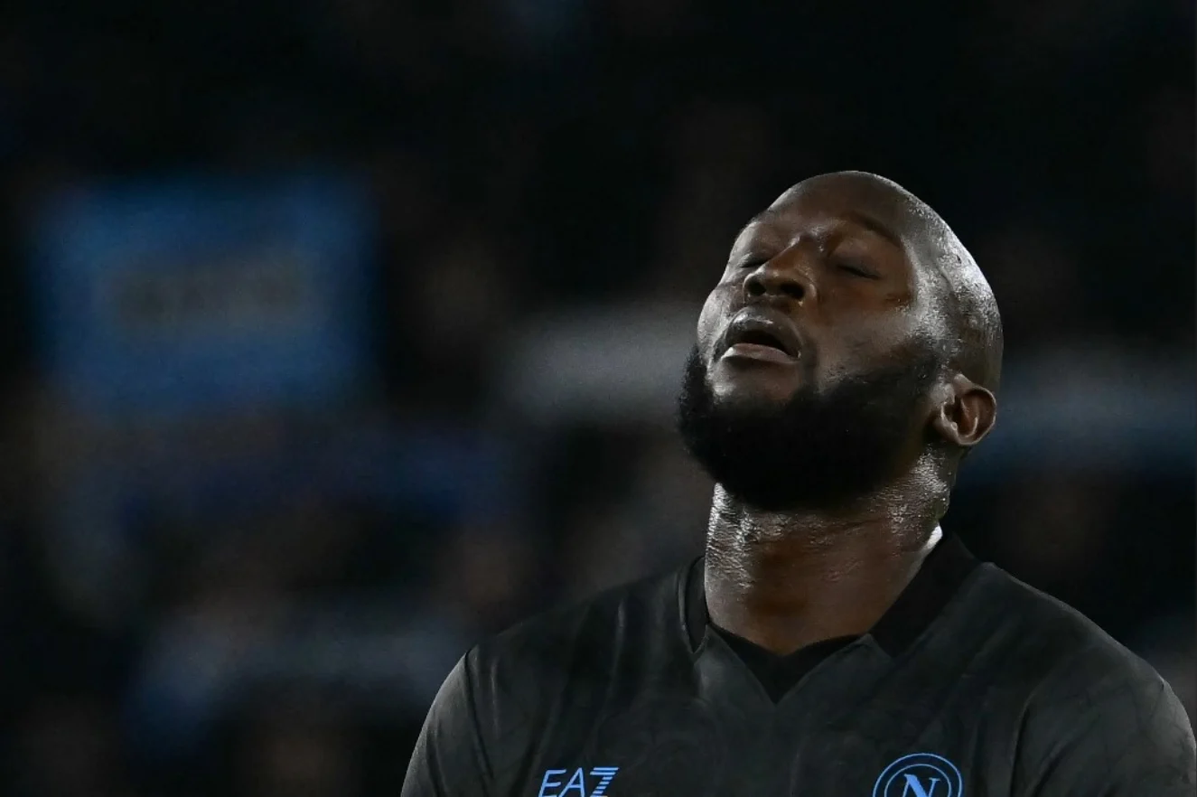 Napoli's Belgian forward #11 Romelu Lukaku reacts at the end of the Italian Serie A football match between Lazio and Napoli at the Olympic Stadium in Rome on February 15, 2025. (Photo by Filippo MONTEFORTE / AFP)