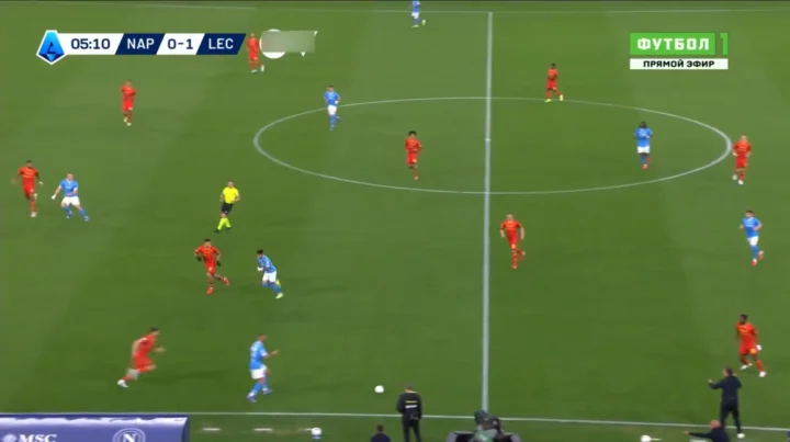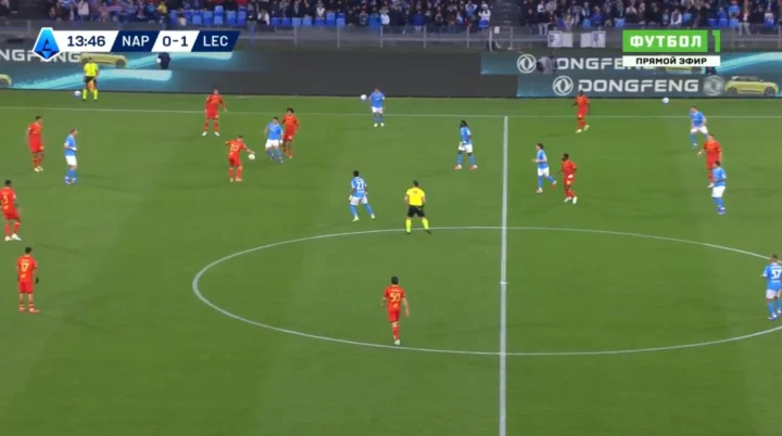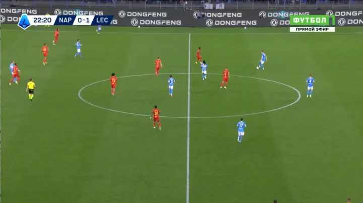 Come si vede in quest’ultimo frame, e come detto in precedenza, di fatto il Lecce è come se si fosse “incastrato” rispetto al modulo del Napoli. In questo modo ha portato portare un pressing alto e intenso senza accusare grossi scompensi. È così, cioè grazie a questa aggressività sulla costruzione della squadra di Conte, che si sono determinate le condizioni perché i giallorossi andassero in vantaggio. Certo, la rete di Seibert è arrivata sugli sviluppi di un corner, e dopo pochissimi secondi di gioco, ma chi ha visto la partita sa benissimo che quel calcio d’angolo – per altro il secondo assegnato al Lecce in meno di due minuti di gioco – è stato guadagnato grazie al coraggio di andare a pressare alto il Napoli.