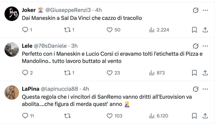 Con la vittoria di Sal Da Vinci il Festival di Sanremo è diventato una barzelletta. Non lo guarderò più anche se ha fatto talmente pena quest’anno che era inguardabile a prescindere. Ho visto solo un pezzo della finale e mi è bastato…