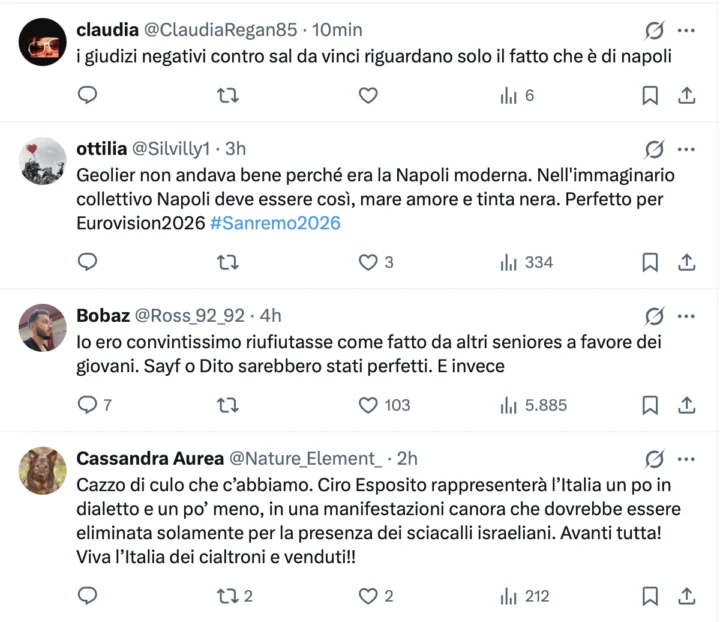 La vittoria di Sal Da Vinci al festival di Sanremo ha fatto impazzire l’Italia razzista, l’Italia che odia Napoli di un odio purissimo. Che impazzisce a ogni vittoria targata Napoli. E il successo del cantante napoletano al festival dei fiori, ha fatto riemergere il peggio dei bassi degli istinti degli italiani. Che nel 1990 fischiavano Maradona in ogni stadio. E oggi, travestiti da opinionisti, vomitano fiele nei confronti di Conte (e a tenere bordone ci sono gli incompetenti dei tifosi del Napoli: ce n’è a bizzeffe).