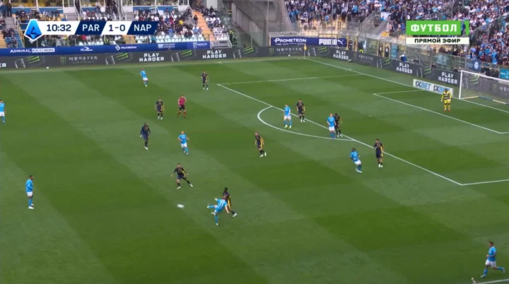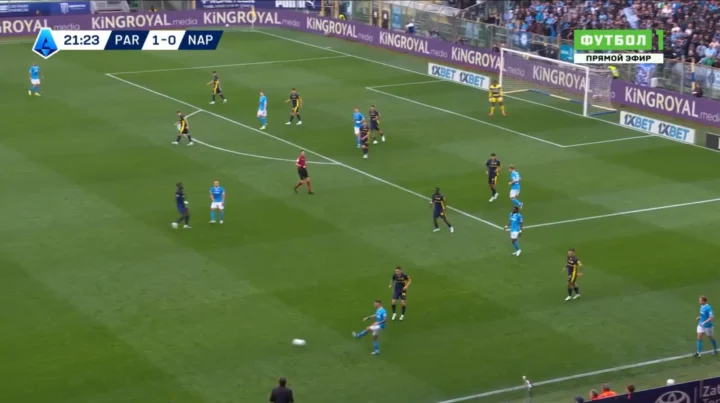 A Parma, però, questa mossa non ha funzionato: il baricentro bassissimo tenuto dal Parma (addirittura a 37 metri di media) e l’altissima densità in tutti i corridoi ha portato il Napoli a esasperare la ricerca del traversone. Anche perché Cuesta ha fatto un cambio ancora più conservativo, se possibile: ha inserito Sorensen (un esterno) al posto della prima punta Elphege, avanzando Strefezza nel ruolo di prima punta. In questo modo, il Parma ha chiuso ulteriormente gli spazi per le verticalizzazioni, portando il Napoli a giocare soprattutto in ampiezza. Come dire: 24 cross in un solo tempo non si fanno per caso.