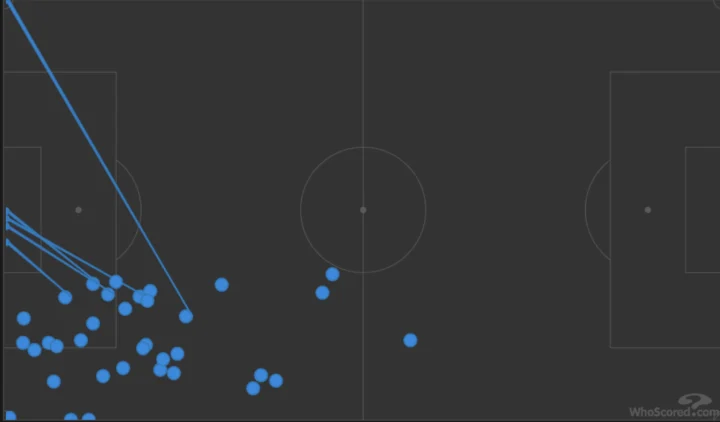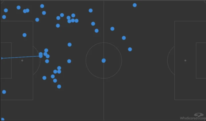 Il Napoli, quindi, ha cercato soprattutto di imbucare il pallone da sinistra verso Hojlund, facendosi aiutare anche da De Bruyne: il belga, schierato almeno in teoria come trequartista laterale a destra, ha danzato su tutto il fronte offensivo alla ricerca del pallone e della giocata buona. Si vede chiaramente da questa mappa dei palloni giocati, che spazia in maniera quasi randomica sull’intera trequarti:
