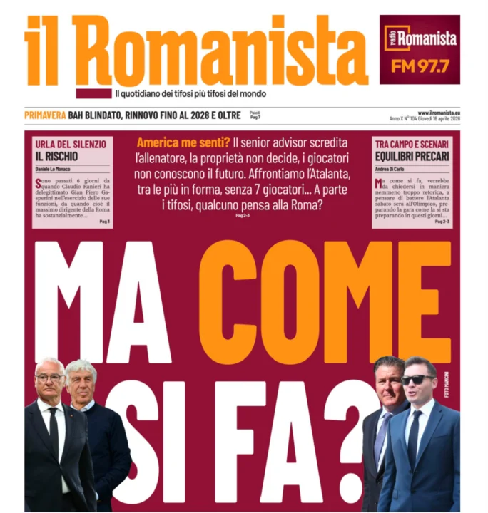 Oggi il quotidiano il Romanista sbatte il mostro in prima pagina. Il mostro è lo psicodramma della Roma dei Friedkin, dei Ranieri, dei Gasperini. Con ciascuno che tira dalla propria parte. Titolone a tutta pagina: “Ma come si fa?” E ancora: “Il senior advisor (ossia Ranieri, ndr) scredita l’allenatore, la proprietà non decide, i giocatori non conosco il futuro. Affrontiamo l’Atalanta, tra le più in forma, senza sette giocatori… A parte i tifosi, qualcuno pensa alla Roma?”
